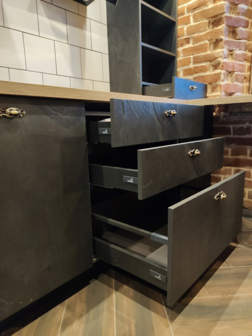 Шпон камня — это инновационный материал, который позволяет использовать настоящую сланцевую поверхность в интерьере. Легкость и гибкость шпона делают его идеальным выбором для создания кухонных фасадов с уникальными текстурными рисунками, придающими кухне естественный и роскошный вид. Кроме того, шпон камня отличается устойчивостью к влаге и температурным перепадам, что делает его идеальным решением для кухонного пространства.